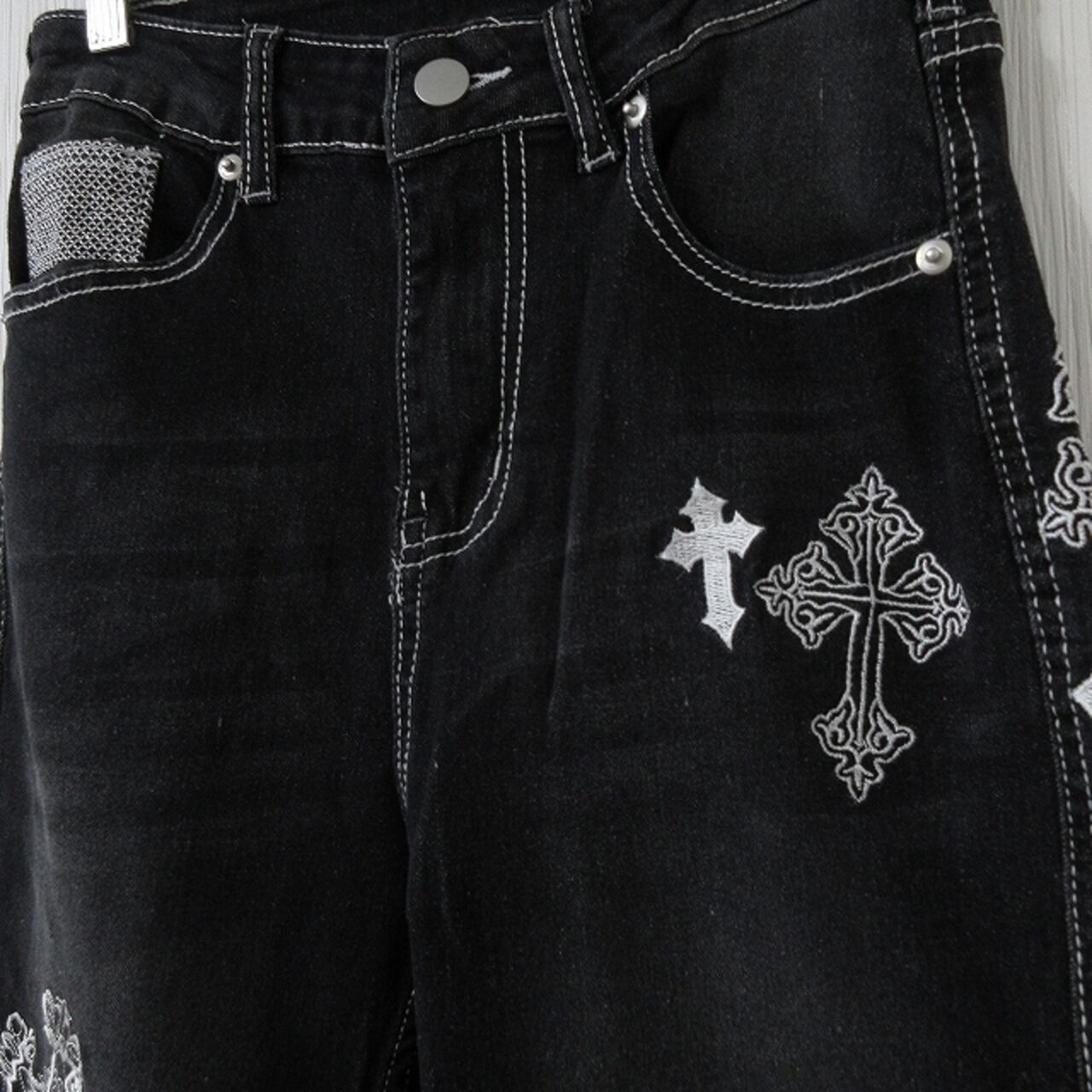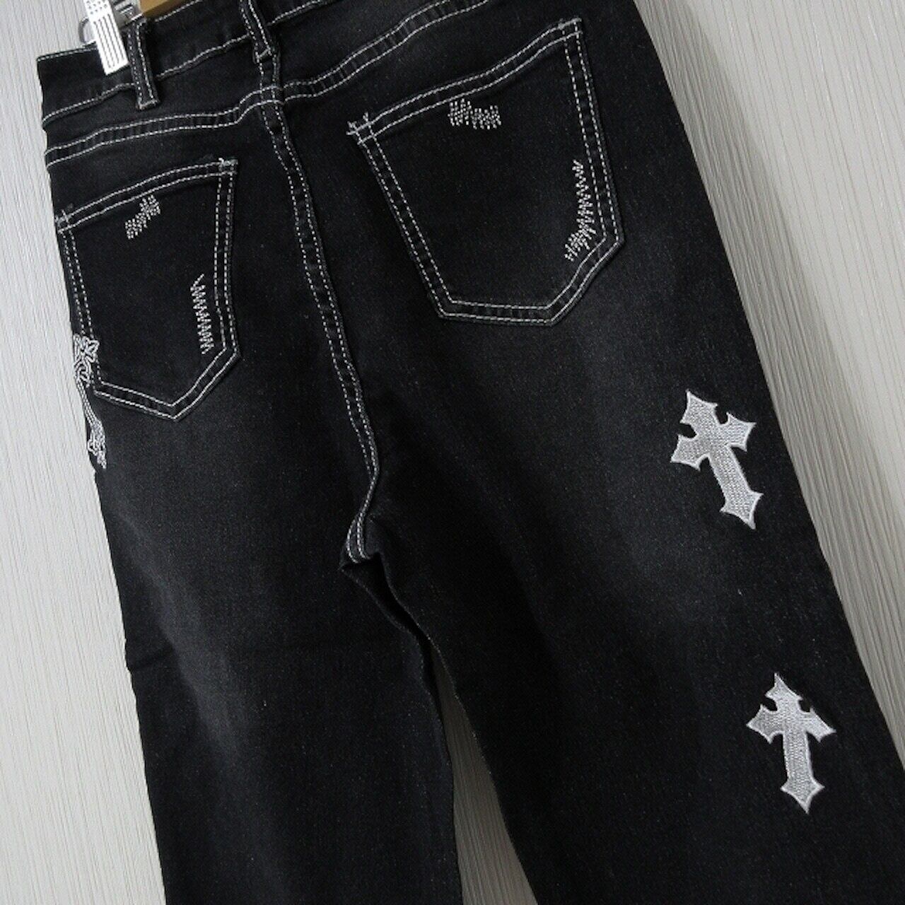 クロス刺繍 タトゥ ALL刺繍 美脚脚長 ストレッチ ベルボトム デニム インポート